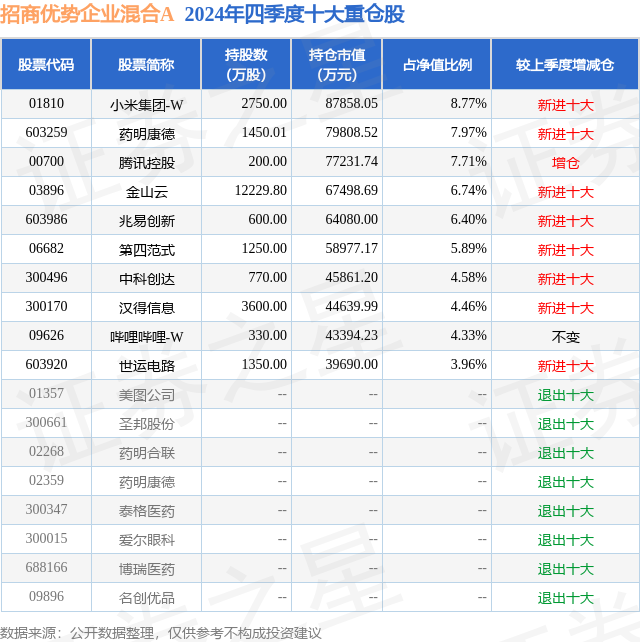 招商优势企业混合A的前十大重仓股如下: